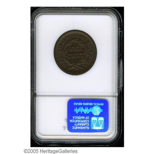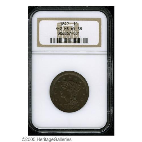 <B>1849<1C> MS65 Brown NGC.</B></I> N-2, R.2. Consistent golden-brown color and a paucity of spots ensures the eye appeal. Well struck on the major devices, while a few stars lack complete centrils. A beautifully preserved representative of this popular 'crumbling reverse' variety, which has perhaps thirty known die states. NGC N-2 Population: 1 in 65, none finer (8/05).
