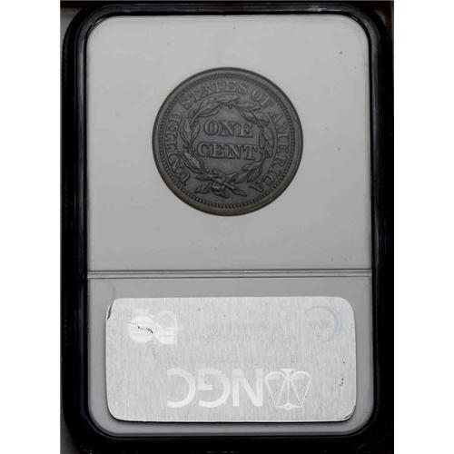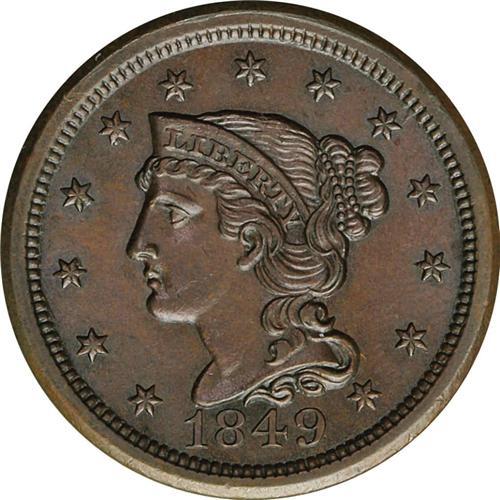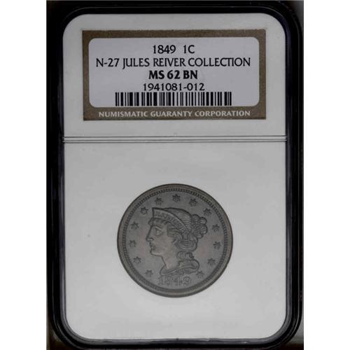 1849 1C N-27, High R.4. MS62 Brown NGC. AU55 EAC. Grel 1849[1C] N-27, High R.4. MS62 Brown NGC. AU55