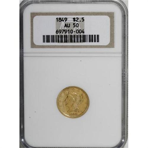 <B>1849 $2 1/2 AU50 NGC.</B></I> An attractive example of this quarter eagle issue of 23,294 pieces, struck in the last year before Philadelphia would receive large quantities of gold from California. Solidly struck with light, even wear and scattered marks on the luminous orange-gold surfaces.<BR><BR><B>Coin Engraver:</B> Christian Gobrecht<BR><BR><b>Shipping:</b> Coins & Currency (<a target="_blank" href="http://www.heritageauctions.com/common/shipping.php">view shipping information</a>)