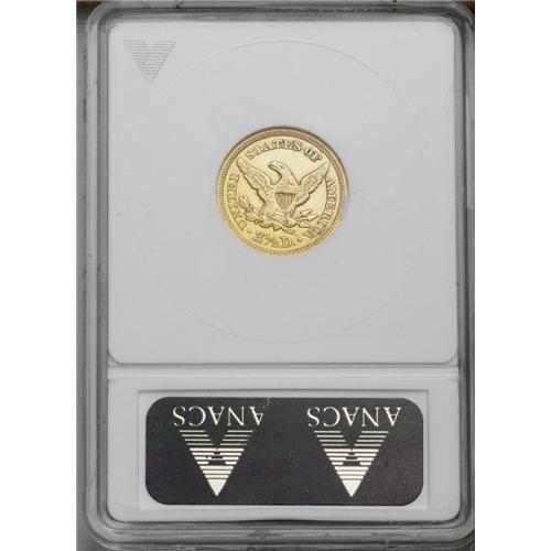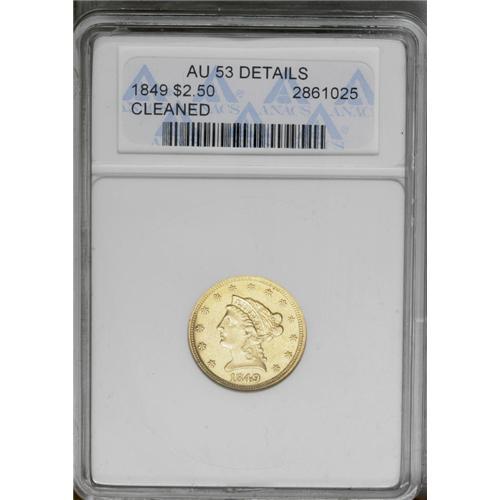 <B>1849<$2 1/2>--Cleaned--ANACS. AU53 Details.</B></I> A harshly cleaned example that has little actual circulation wear. Softness of detail on the eagle's neck and left leg is due to the strike. A much better date, since just 23,294 pieces were coined.