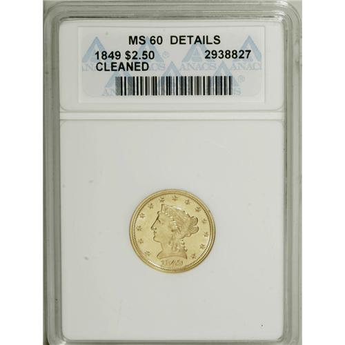 <B>1849 $2 1/2 --Cleaned--ANACS. MS60 Details.</B></I> This hairlined and perhaps unnaturally prooflike piece is well struck aside from moderate softness on the eagle's left (facing) leg. A rare date in Mint State.<BR><I>From The Twin Hollows Collection, Part Two.</B></I><BR><BR><b>Shipping:</b> Coins & Currency (<a target="_blank" href="http://www.heritageauctions.com/common/shipping.php">view shipping information</a>)