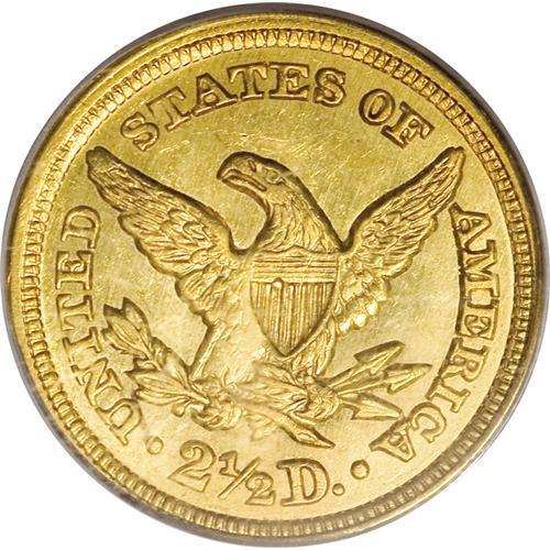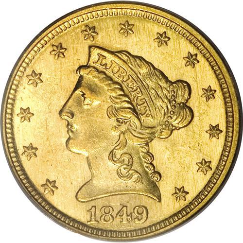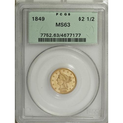 <B>1849 $2 1/2 MS63 PCGS.</B></I> The 1849 is a scarce and overlooked issue that compares (especially in high grades) to its better known C- and D-mint counterparts. This deeply reflective example is sharply defined, except on the eagle's left leg, the usual place for weakness on quarter eagles from this era. The lightly abraded surfaces show just a hint of reddish patina on each side. Certified in a green-label holder. Population: 4 in 63, 2 finer (12/06).<BR><BR><b>Shipping:</b> Coin/Currency (<a target="_blank" href="http://www.heritageauctions.com/common/shipping.php">view shipping information</a>)