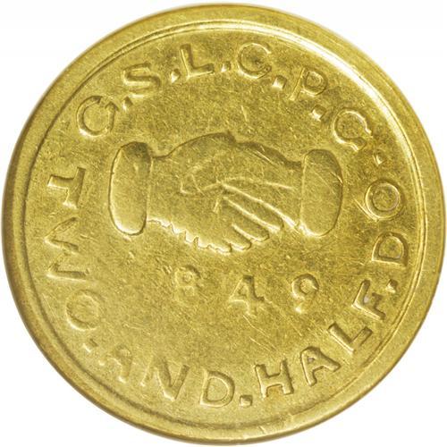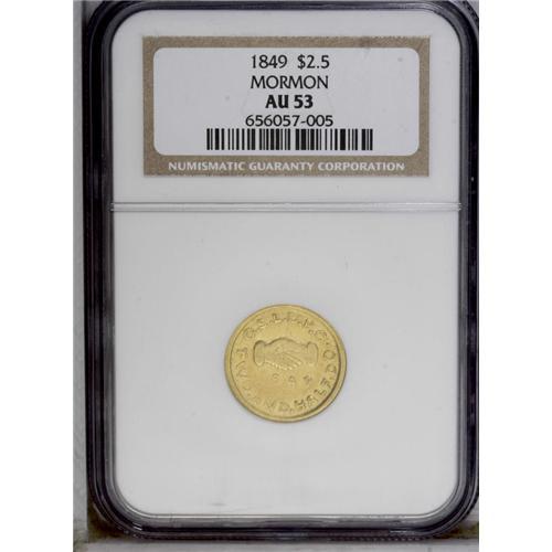 <B>1849<$2 1/2> Mormon Quarter Eagle AU53 NGC.</B></I> K-1, High R.5. A rare, popular, and elusive territorial gold issue. The buckling seen on the lower reverse, below the well-detailed Eye of Jehovah, is typical. The only obvious weakness is on the 1 in the date, which has disappeared. This piece apparently has seen only light circulation, with a few light abrasions seen under a loupe, yet with considerable luster clinging to the devices. There are a few light pinscratches through the central obverse clasped hands device. The strike is only slightly off-center, toward 6 o'clock on the obverse. Listed on page 361 of the 2006 <I>Guide Book.</B></I> <BR><BR><B>Important notice:</B> Heritage usually auctions material at the rate of 200-250 lots per hour. On some occasions eBay Live bid software or the Internet may not be able to keep up with the pace of the auction. We recommend placing a realistic absentee bid now as insurance to avoid disappointment. Occasionally the auctioneer may eliminate or reject an eBay Live bid, and the auctioneer may also reopen a lot after the close of the eBay live bidding (usually because we missed an audience bid), and may reject your bid even if it shows you as the winning bidder. By bidding via eBay Live, you agree that Heritage may award the lot to another bidder at its sole discretion under the circumstances described above or any other reasonable circumstances. Since eBay bids are not shown to us until we open the lot on the floor, we treat those bids just like floor bids. In most cases the floor responds before the eBay bid is presented to us, due to Internet lag time, so for consistency we have made it a policy that floor bids are always considered first over tie eBay live bids. Also please note that all Heritage lots purchased through eBay Live carry a 20% Buyer's Premium. Please make sure you read the Terms and Conditions before you bid. This lot is being auctioned in conjunction with a live floor auction by Heritage Galleries & Auctioneers. All final auction and invoice information will be supplied by Heritage Galleries & Auctioneers, and all other information should be considered preliminary. Lot:4776 <BR><BR><B>Winning Notification and Billing:</B> After the FINAL session in this auction is complete, Heritage will send e-mail and snail mail invoices. This process normally takes several days. All final auction and invoice information will be supplied by Heritage Galleries & Auctioneers, and all other information should be considered preliminary. <BR><BR>This auction will be conducted on a live auction floor and over the Internet through eBay Live. If you choose to place an absentee bid, please take a moment to <font color='#0000ff'><u><a href='http://pages.ebay.com/liveauctions/help/before/laabsentee.html'>learn how eBay Live absentee bidding works</a></u></font><font color='#000000'>