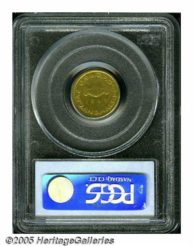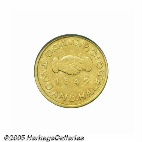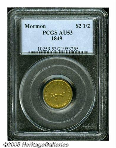 <B>1849<$2 1/2> Mormon Quarter Eagle AU53 PCGS.</B></I> K-1, High R.5. A highly desirable example of this sought-after rarity, especially so in high grade. Although a few finer coins exist, this particular sale actually has a selection of these elusive coins. Struck from gold dust collected along the American River in California, soon after the Gold Rush began in 1848-49. The obverse die show buckling through the lower portion of the all seeing eye, which weakens that area, and this is diagnostic for this issue. Struck from the native California gold with additional alloys added which brought the gold content below the stated value on the coins. Once this fact was discovered, few merchants accepted these coins outside the Mormon church, and the vast majority of the issue was melted. Finding an attractive example as seen here might take the territorial specialist years of searching. This particular coin is identifiable by a small nick on the upper left of the N in HOLINESS. Even yellow-gold in color with traces of luster in the protected areas. We suspect that this coin barely circulated, and the buckling of the obverse die caused the devices to be weak as opposed to wear from circulation. An important coin that is not to be missed. Listed on page 308 of the 2005 <I>Guide Book.</B></I> Population: 2 in 53, 7 finer (6/05).<BR><I>From The Great Western Collection of Territorial Gold.</B></I>