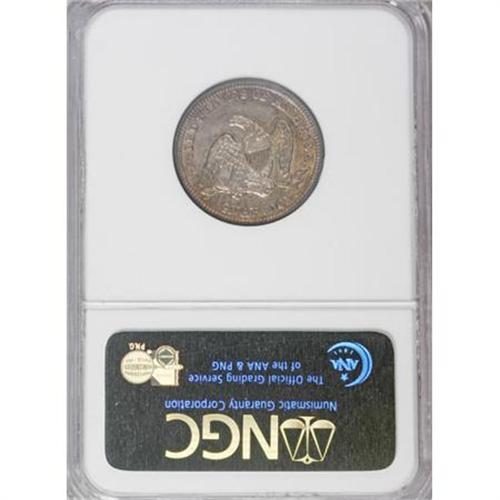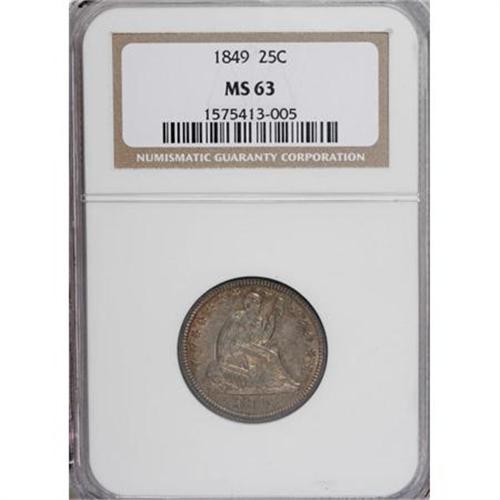 <B>1849 25C MS63 NGC.</B></I> Briggs 2-A. Stars 10 to 13 show heavy recutting, and the reverse is of the "Compass Point" variety, having a circular incomplete area within the first set of vertical lines at horizontal line juncture. The 1849 is rare in Uncirculated, for which Larry Briggs (1981) assigns an R.5 rarity rating. Golden-tan patina shows blushes of lavender. Generally well struck, with nice luster and minimal marks. Census: 6 in 63, 6 finer (6/07).<BR><BR><b>Shipping:</b> Coins & Currency (<a target="_blank" href="http://www.heritageauctions.com/common/shipping.php">view shipping information</a>)