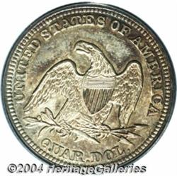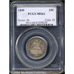 <B>1849<25C> MS64 PCGS.</B></I> Struck the year of the California Gold Rush, because of the greatly increased shipments of gold from the west coast and rising silver prices, most of the 340,000 quarters struck this year were melted by bullion speculators. As a result, the 1849 is an absolute as well as condition rarity. Only three other pieces have been so graded by PCGS with two finer (7/04). This is a well defined example that has thick, satiny mint luster. Each side is toned in rich shades of crimson-golden and thalo-blue with pale gray-golden patina over the devices and in the fields. An important coin for the Seated quarter collector. <BR><BR><B>Important notice:</B> Heritage usually auctions material at the rate of 200-250 lots per hour. On some occasions eBay Live bid software or the Internet may not be able to keep up with the pace of the auction. We recommend placing a realistic absentee bid now as insurance to avoid disappointment. Occasionally the auctioneer may eliminate or reject an eBay Live bid, and the auctioneer may also reopen a lot after the close of the eBay live bidding (usually because we missed an audience bid), and may reject your bid even if it shows you as the winning bidder. By bidding via eBay Live, you agree that Heritage may award the lot to another bidder at its sole discretion under the circumstances described above or any other reasonable circumstances. Since eBay bids are not shown to us until we open the lot on the floor, we treat those bids just like floor bids. In most cases the floor responds before the eBay bid is presented to us, due to Internet lag time, so for consistency we have made it a policy that floor bids are always considered first over tie eBay live bids. Also please note that all Heritage lots purchased through eBay Live carry a 20% Buyer's Premium. Please make sure you read the Terms and Conditions before you bid. </span></font></tr></table></td></tr></table>