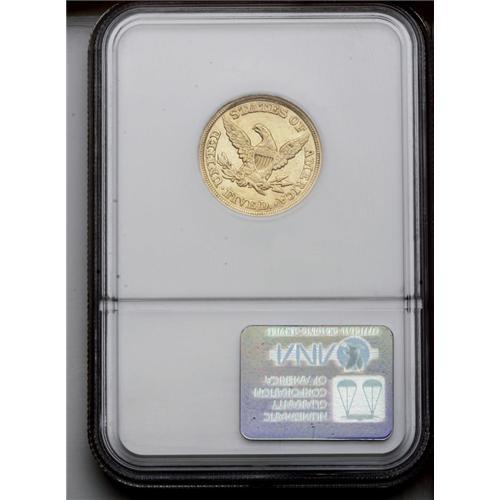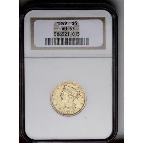 <B>1849 $5 AU53 NGC.</B></I> Doubled 849. Breen-6582. Listed as "extremely rare" in the Breen <I>Encyclopedia,</B></I> the date is dramatically repunched and is evident to the unaided eye. However, many of the '49 fives we see have this feature and we feel this is only a slightly scarcer variety. Well struck with some luster remaining in the crevices.