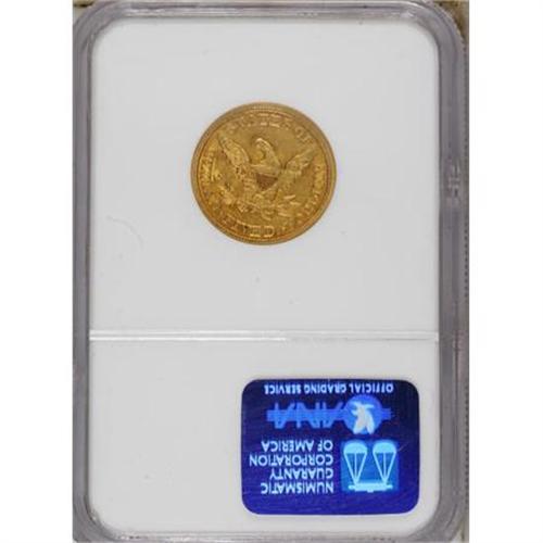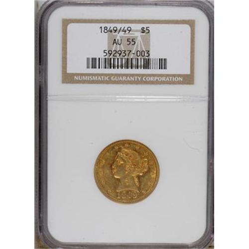 <B>1849/49 $5 AU55 NGC.</B></I> Breen-6582. The 49 in the date is boldly repunched south. Orange and rose toning enhances this refreshingly unmarked No Motto five. Ample luster brightens recessed areas. The eagle's neck is typically struck. Census: 6 in 55, 10 finer (5/07).<BR><BR><b>Shipping:</b> Coins & Currency (<a target="_blank" href="http://www.heritageauctions.com/common/shipping.php">view shipping information</a>)