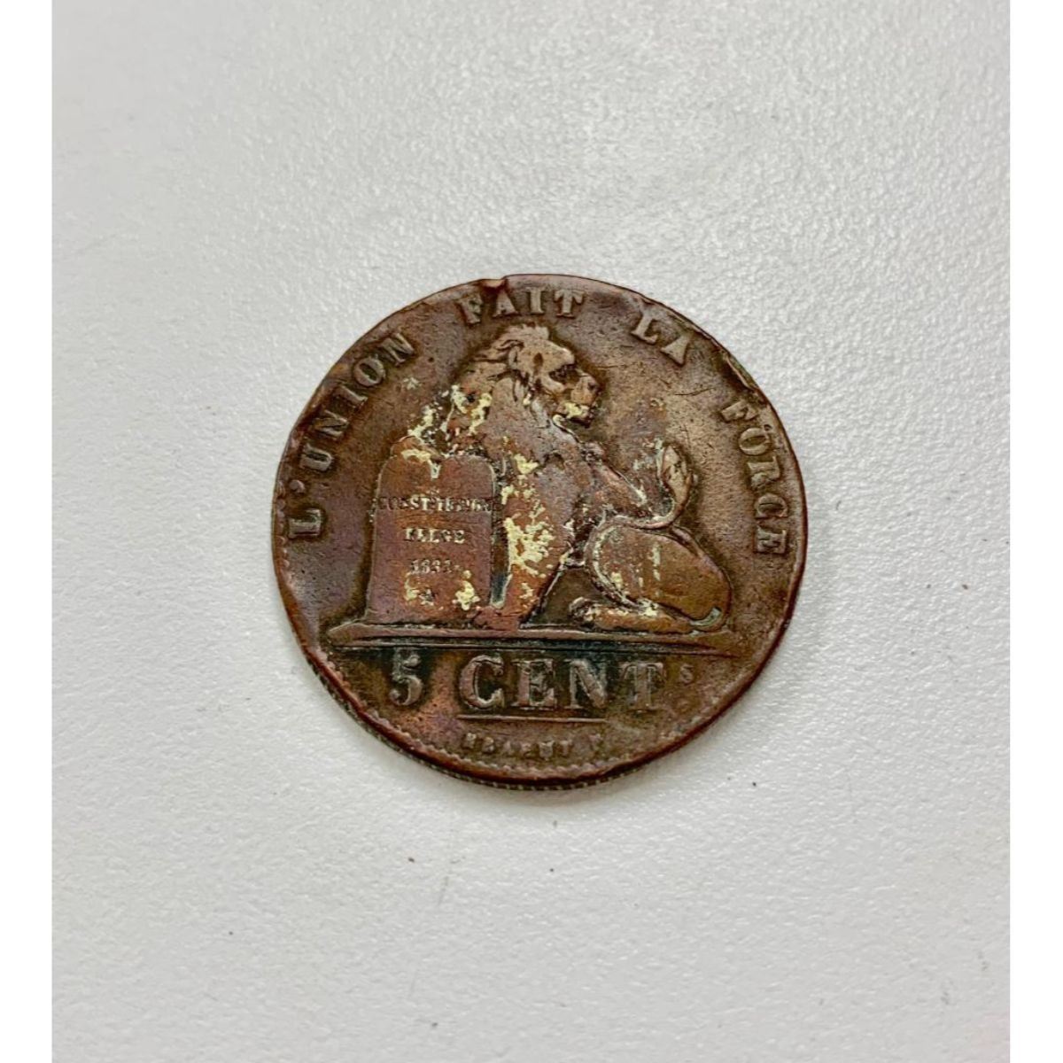 Obverse The royal monogram is surrounded with lettering in French. Date below. Lettering: LEOPOLD PREMIER ROI DES BELGES 1849 Translation: LEOPOLD FIRST KING OF THE BELGIANS 1849 Engraver: Joseph-Pierre Braemt Reverse A lion, symbol of Belgium, with a paw over the Belgian Constitution dating 1831. Around is the Belgian motto in French. Value and designer below. Lettering: L'UNION FAIT LA FORCE CONSTITUTION BELGE 1831* 5 CENTs BRAEMT F. Translation: UNITY MAKES STRENGTH BELGIAN CONSTITUTION 1831* 5 CENTIMES BRAEMT (F = Fecit = Made by) Engraver: Joseph-Pierre Braemt Edge Reeded Specifications Country: Belgium King: Leopold I (1831-1865) Type: Standard circulation coin Years: 1811-1860 Value: 5 Centimes (0.05 BEF) Currency: Franc (1832-2001) Composition: Copper Weight: 10 g Diameter: 28 mm Shape: Round