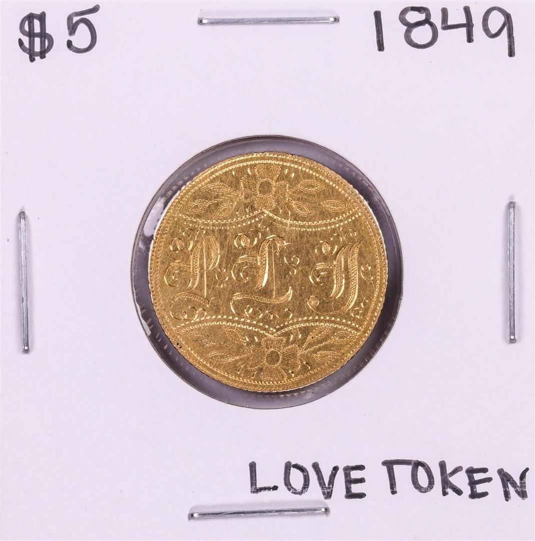 One 1849 $5 Liberty Head Half Eagle Love Token Coin Pin.