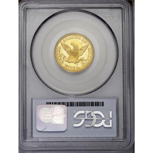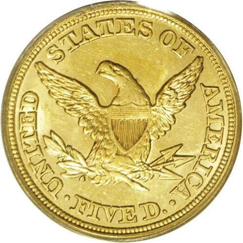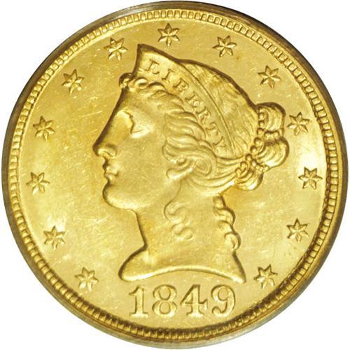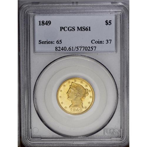 <B>1849 $5 MS61 PCGS.</B></I> The mintage for the 1849 is high with 133,070 pieces produced. However, it is certainly not a common date as one might believe if only the mintage were used as an indicator of rarity. The obverse details are well defined, but the reverse is somewhat soft on the eagle's plumage. The surfaces are a bright yellow-gold with occasional splashes of deeper orange-gold, and display nearly unbroken luster. A few small marks, especially on the obverse, limit the grade. All in all, quite a decent coin for the grade. Population: 4 in 61, 2 finer (1/06).