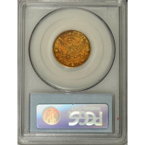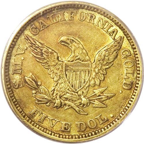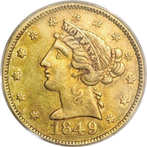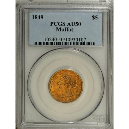 <B>1849 $5 Moffat & Co. Five Dollar AU50 PCGS.</B></I> K-4, R.5. No die break E DO. A well struck example that intermixes lime-green and purple-red patina over both sides. There is typically soft definition on the hair curls and the eagle's neck feathers. Lightly worn on the highpoints with a few small marks, a die crack that diagonally bisects the eagle's shield from near 4 o'clock on the reverse rim, and some noticeable die clash marks in the reverse fields. Listed on page 348 of the 2007 <I>Guide Book.</B></I><BR><BR><b>Shipping:</b> Coin/Currency (<a target="_blank" href="http://www.heritageauctions.com/common/shipping.php">view shipping information</a>)