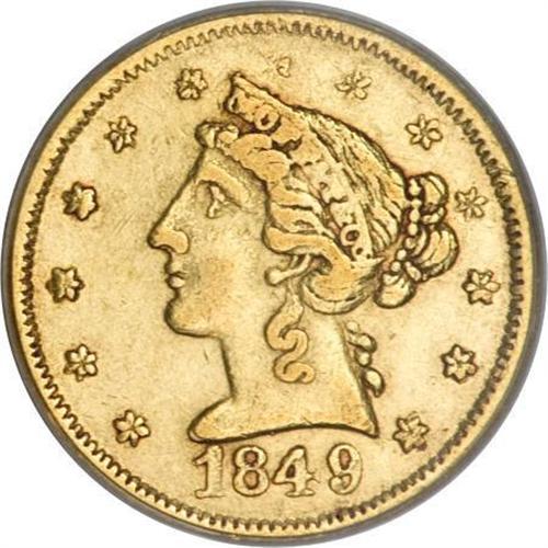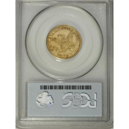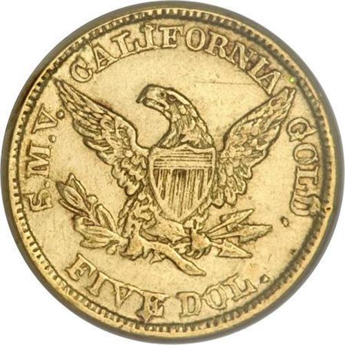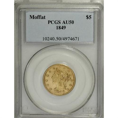 <B>1849 $5 Moffat & Co. Five Dollar AU50 PCGS.</B></I> K-4a, R.4. Nicely struck for a private gold coin, and the green-gold surfaces are smooth for the grade and type. Luster glows from design recesses. Expect to pay a premium for the present piece. From late dies with a break atop the D in GOLD. Listed on page 352 of the 2009 <I>Guide Book.</B></I> Population: 13 in 50, 32 finer (3/08).<BR><BR><b>Shipping:</b> Coins & Currency (<a target="_blank" href="http://www.heritageauctions.com/common/shipping.php">view shipping information</a>)