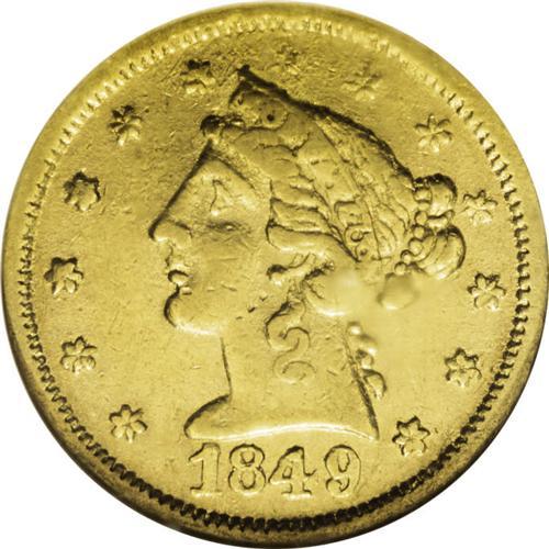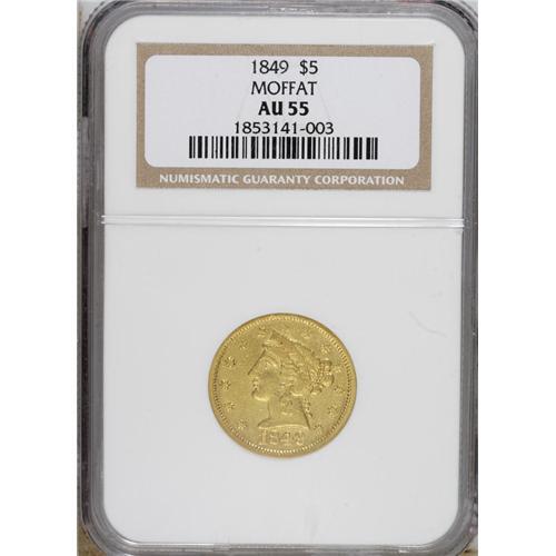 <B>1849 $5 Moffat & Co. Five Dollar AU55 NGC.</B></I> K-4a, R.4. Moffat & Co. was the most respected of the private gold coiners between 1849 and 1853, principally because the firm redeemed their product in silver coin. This green-gold representative retains substantial luster, and the fields exhibit only modest marks. Struck from crumbling dies. Census: 11 in 55, 35 finer (4/07).<BR><BR><b>Shipping:</b> Coins & Currency (<a target="_blank" href="http://www.heritageauctions.com/common/shipping.php">view shipping information</a>)