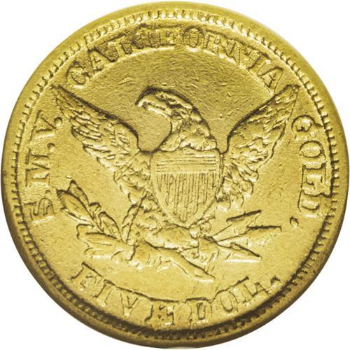 1849 $5 Moffat & Co. Five Dollar AU55 NGC. K-4a, R.4.