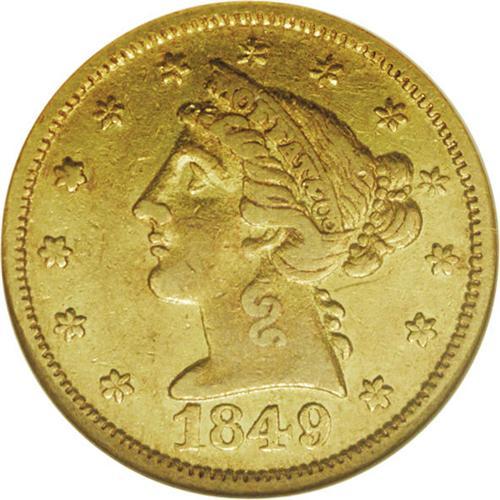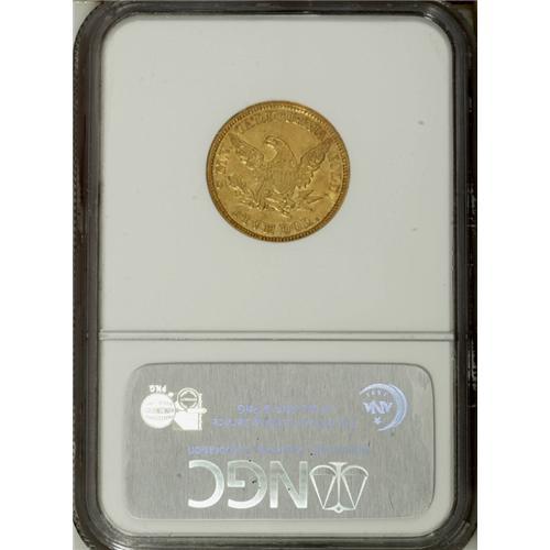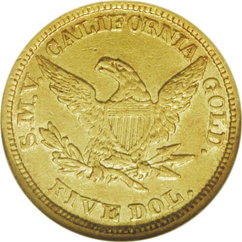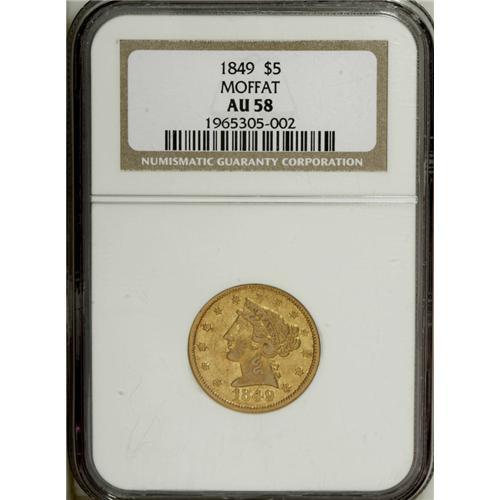 <B>1849 $5 Moffat & Co. Five Dollar AU58 NGC.</B></I> K-4, R.5. A liberal dose of reddish patina accents both sides. The striking details are typically soft on the hair curls and the eagle's neck feathers. While modestly abraded for this workhorse territorial issue, several paper-thin blemishes are noticed in the fields. Listed on page 348 of the 2007 <I>Guide Book.</B></I><BR><I>From The Twin Hollows Collection.</B></I><BR><BR><b>Shipping:</b> Coin/Currency (<a target="_blank" href="http://www.heritageauctions.com/common/shipping.php">view shipping information</a>)
