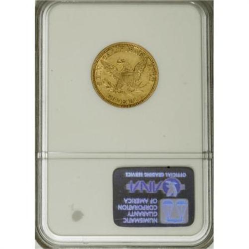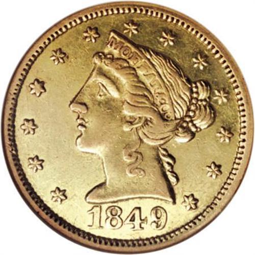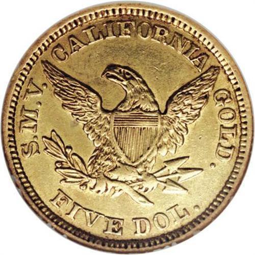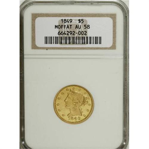 <B>1849 $5 Moffat & Co. Five Dollar AU58 NGC.</B></I> K-4, R.5. Almost full luster remains on this near-Mint example with subtle frost on otherwise satin surfaces. Bright yellow color is subdued by pale orange on the highpoints, indicating a trace of wear. Apparently an early strike from perfect, uncracked dies. Moffat & Co. was one of the early gold issuers in California, maintaining an element of respect during a time when certain other firms were discredited. Listed on page 352 of the 2008 <I>Guide Book</B></I>.<BR><BR><b>Shipping:</b> Coins & Currency (<a target="_blank" href="http://www.heritageauctions.com/common/shipping.php">view shipping information</a>)