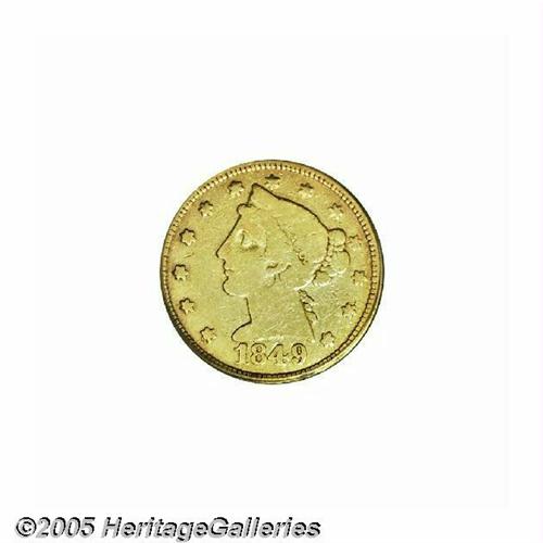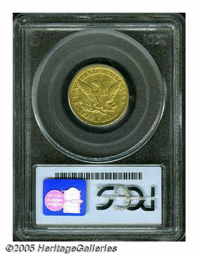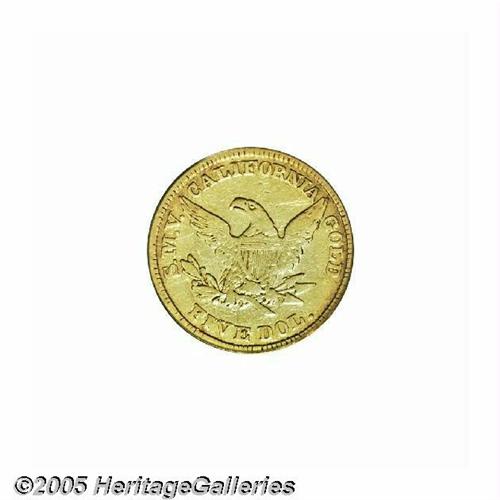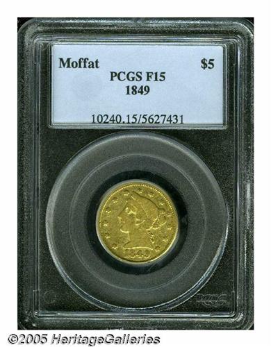 <B>1849<$5> Moffat & Co. Five Dollar Fine 15 PCGS.</B></I> K-4, R.4. Although wear is obvious on Liberty's hair and the eagle's plumage, the bottom half of the letters in MOFFAT & CO are legible. A few wispy pinscratches on the upper reverse do not distract. The facilities of private coiner Moffat & Co. evolved into the first U.S. San Francisco Mint. Listed on page 295 of the 2005 <I>Guide Book.</B></I>