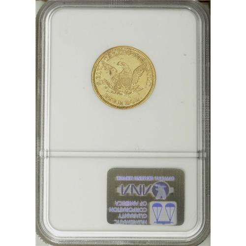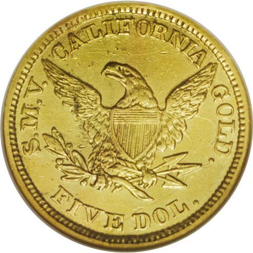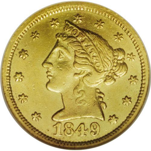 <B>1849 $5 Moffat & Co. Five Dollar MS62 NGC.</B></I> K-4, R.5. An unmarked straw-gold representative with attractive eye appeal. Sharply struck for a territorial gold piece, although the curls near the ear are slightly soft. The luster is subdued, and a subtle repair is noted on the dentils above the first A in CALIFORNIA. Struck from clashed dies. Listed on page 348 of the 2007 <I>Guide Book.</B></I> Census: 8 in 62, 7 finer (8/06).<BR><I>From The Jones Beach Collection.</B></I><BR><BR><b>Shipping:</b> Coin/Currency (<a target="_blank" href="http://www.heritageauctions.com/common/shipping.php">view shipping information</a>)
