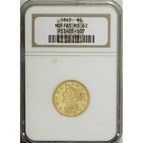 1849 $5 Moffat & Co. Five Dollar MS62 NGC. K-4, R.5. A
