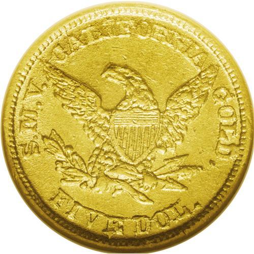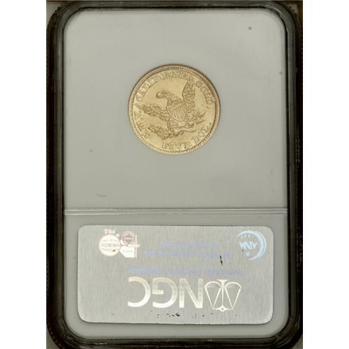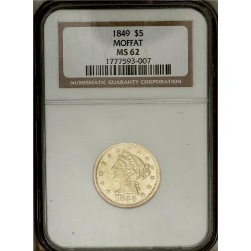 <B>1849<$5> Moffat & Co. Five Dollar MS62 NGC.</B></I> K-4a, R.4. John Little Moffat was born in Goshen, New York on February 21, 1788. A veteran of the Southern Appalachian Gold Rush of the 1830s, he and Curtis, Perry, and Ward traveled to California and established Moffat & Co. on the San Francisco waterfront. After the Bavarian-born engraver George Albrecht Ferdinand Kuner joined the firm from New York, Moffat & Co. enacted plans to produce gold coins. Despite characteristic softness of strike, this piece is well preserved and attractive. The lustrous surfaces exhibit a distinctly granular texture as well as pleasing yellow-green patination. Just a few small abrasions are noted on each side. Many of Moffat & Co.'s gold issues were melted to provide bullion for the San Francisco Mint's first coinage of 1854, making Mint State Moffat half eagles like this one extremely hard to find. Listed on page 348 of the 2007 <I>Guide Book.</B></I> Population: 8 in 62, 6 finer (7/06).