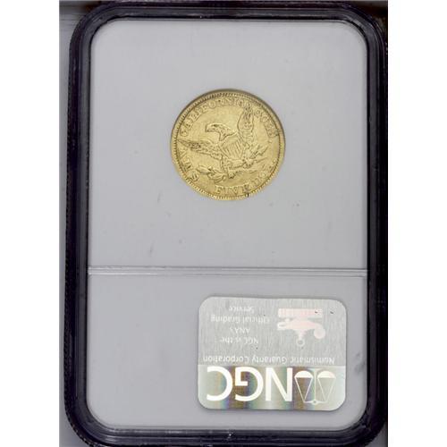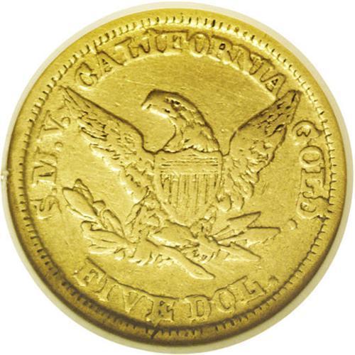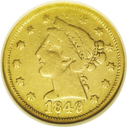 <B>1849<$5> Moffat & Co. Five Dollar VF25 NGC.</B></I> K-4a, R.4. A die crack on the reverse connects the O and L in DOL. The IVE in FIVE are all connected at their tops, and the bottom of the E has a triangular chip out of the die just below the upright. Other defects show on various other letters n the reverse. This piece shows moderate circulation wear, of course, but there are no singularly mentionable and distracting abrasions on the greenish-gold surfaces. The reverse die is rotated about 45 degrees counterclockwise.