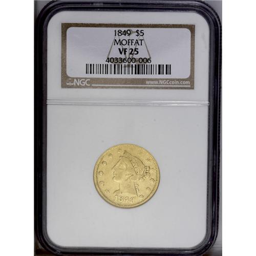 1849 $5 Moffat & Co. Five Dollar VF25 NGC. K-4a, R.4.
