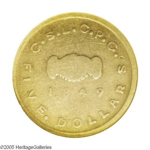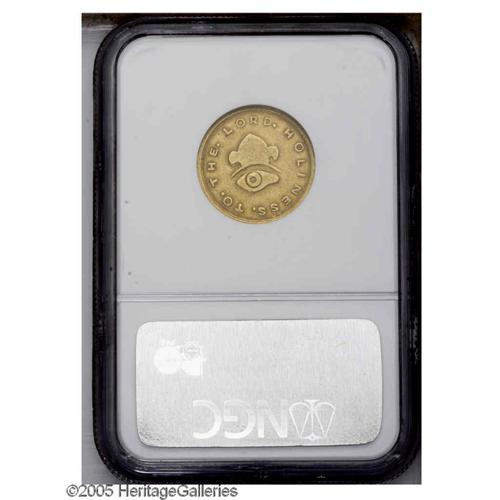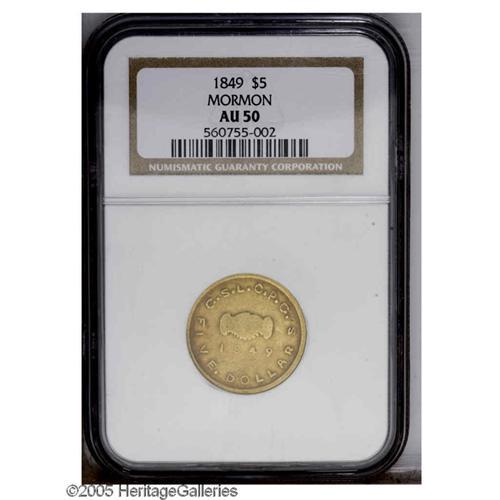 <B>1849<$5> Mormon Five Dollar AU50 NGC.</B></I> K-2, R.5. The Mormons struck gold coins for the benefit of their own economic community, however, many of the pieces were used to purchase goods throughout the United States. In early 1850, William P. Hort, the assayer of the New Orleans Mint, obtained an example of the Mormon twenty dollar gold piece. He concluded that the coin was only .892 fine instead of .900 fine, and weighed 20% less than the specified weight of the United States' regular issue double eagle. Soon thereafter, bankers throughout the country would only accept Mormon coinage at 10-25% below face value. Eventually, the majority of the coins were melted. The present example offers dusky russet-gold peripheral color, while the centers are lighter olive-gold in hue. Thorough evaluation discovers a faint pinscratch above the hands, but no other marks are substantial. The strike is soft on the clasped hands motif, as usual for the type. Listed on page 361 of the 2006 <I>Guide Book.</B></I>