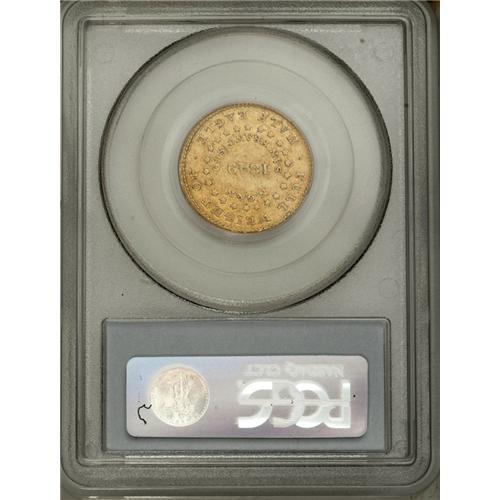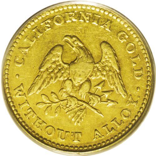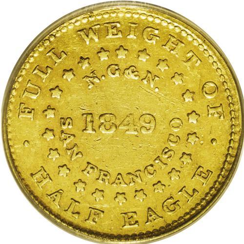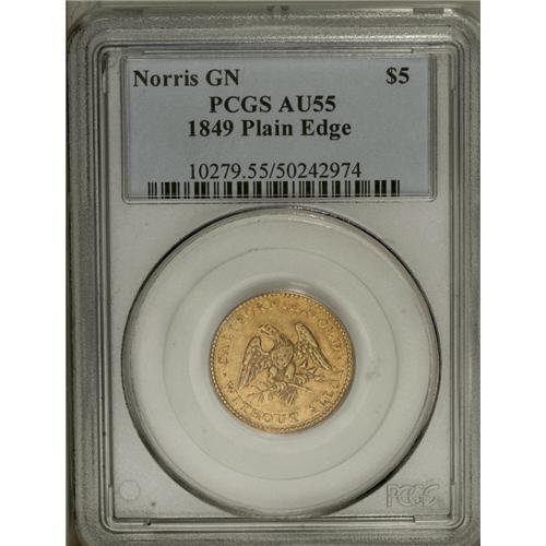 <B>1849<$5> Norris, Gregg, & Norris Five Dollar, Plain Edge AU55 PCGS.</B></I> K-2, R.5. This rare variety has the period after ALLOY, appearing as two periods (with the nearby dot between ALLOY and GOLD). In fact, according to the Kagin gold reference, this is the rarest five dollar after the R.6 reeded edge, No Period variety. This company is acknowledged to have been the first minter of private gold coins in Gold Rush California, with the first issues appearing in May 1849. On May 31, 1849, the first known reference to private coinage appeared in a California newspaper, as the <I>Alta California</B></I> (translated "Upper California," in contrast to Baja California) commented:<BR><BR> <I>We have in our possession a Five Dollar gold coin, struck at Benicia City, although the imprint is San Francisco. In general appearance it resembles the United States coin of the same value, but it bears the private stamp of "Norris, Gregg, & Norris", and is in other particulars widely different.</B></I><BR><BR> This high-grade piece is significant both as the first California private coinage, and as one of the least-common varieties. Much mint luster clings to each side of this pretty orange-gold piece (made "WITHOUT ALLOY"), with only light abrasions on each side testament to its brief spate in circulation. Listed on page 347 of the 2007 <I>Guide Book.</B></I>