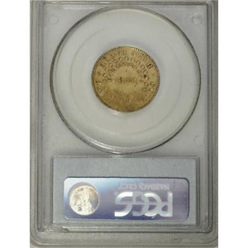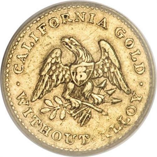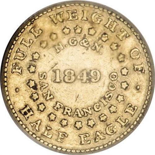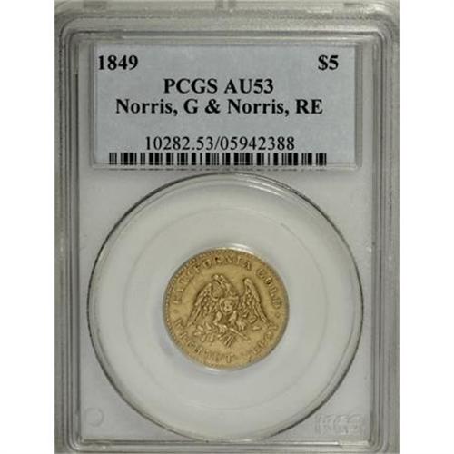 <B>1849 $5 Norris, Gregg, & Norris Five Dollar R.E. AU53 PCGS.</B></I> No Period. K-3, R.6. Norris, Gregg, & Norris was the first California private gold coiner, although the firm's output would soon be surpassed by Moffat & Co. The Period and No Period varieties appear to be struck from the same dies, with the low relief period (after ALLOY) filled on rarer examples. This green-gold example is richly detailed. The obverse field has subdued thin marks, particularly near 6 o'clock, but such abrasions are characteristic of lightly circulated pioneer gold. Listed on page 351 of the 2008 <I>Guide Book</B></I>.<BR><BR><b>Shipping:</b> Coins & Currency (<a target="_blank" href="http://www.heritageauctions.com/common/shipping.php">view shipping information</a>)