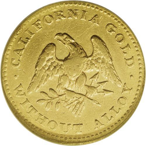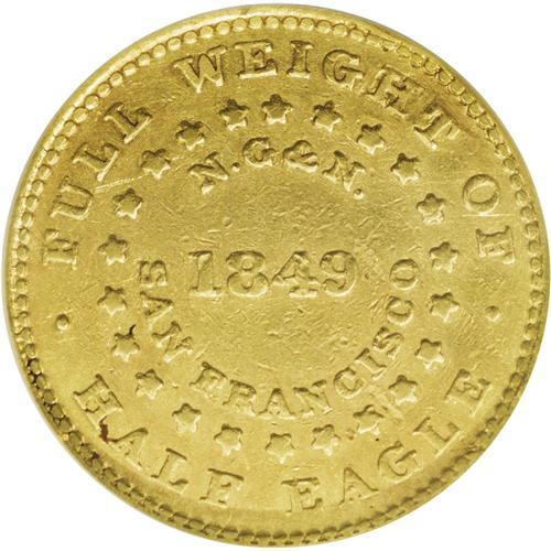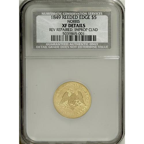 <B>1849 $5 Norris, Gregg, & Norris Five Dollar Reeded Edge--Reverse Repaired, Improperly Cleaned--NCS. XF Details.</B></I> K-3, R.6. The rare variety without a period after ALLOY. The H in WEIGHT shows evidence of repair, and the obverse rim is filed opposite at 10 o'clock. A hairlined but sharp example with detectable luster and bold legends. The 5 on the shield is faintly apparent. Listed on page 347 of the 2007 <I>Guide Book.</B></I><BR><BR><b>Shipping:</b> Coin/Currency (<a target="_blank" href="http://www.heritageauctions.com/common/shipping.php">view shipping information</a>)