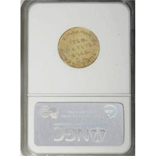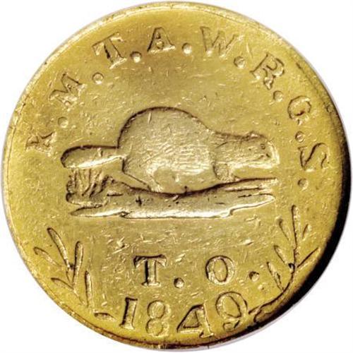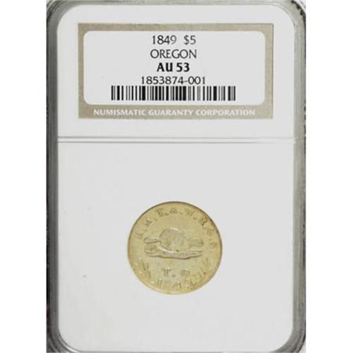 <B>1849 $5 Oregon Exchange Co. Five Dollar AU53 NGC.</B></I> K-1, R.5. The news of the discovery of gold in California reached the Oregon Territory in late July 1848. That news was confirmed in Oregon City, seat of Clackamas County, on August 9 of that year, when the brig <I>Henry</B></I> docked with gold dust, arriving from San Francisco, and by October more than two-thirds of the men in Oregon had departed to seek treasure in the gold fields of California. The <I>Oregon Spectator,</B></I> founded in 1846, one of the first newspapers west of the Mississippi River, was forced to stop publishing in 1848 "because its printer, with 3,000 officers, lawyers, physicians, farmers and mechanics were leaving for the gold fields." (Kagin, <I>Private Gold Coins and Patterns of the United States.)</B></I> By spring of the following year, gold dust had almost entirely replaced beaver and other fur pelts as the primary medium of exchange, although it traded at a substantial discount to silver coins (when available) and to its value at the Philadelphia Mint. Miners were losing money.<BR> Against this backdrop, the Oregon Exchange Company was formed, with the express purpose of weighing and stamping gold. Although Oregon was officially declared a territory of the United States on March 3, 1849--rendering any plan to coin gold clearly unconstitutional--several prominent residents determined to proceed with the plan. The surnames of those residents were Kilborn, Magruder, Taylor, Abernethy, Willson, Rector, (Gill) Campbell, and Smith. Their initials K. M. T. A. W. R. G. S. appear around the rim of the five dollar gold pieces, which also picture a beaver on a log and a laurel wreath. In error, the initials T.O. (rather than O.T., for Oregon Territory) were stamped on the obverse. The five dollar contains the reverse legend OREGON EXCHANGE COMPANY around the periphery, with 130 G. / NATIVE GOLD. / 5 D. in the center. The initials of two men were omitted from the ten dollar pieces struck later, and the T.O. was corrected to O.T.<BR> The gold coinage was unalloyed with silver or copper, and succeeded in raising the price of gold dust from $12 to $16 as the pieces circulated. Alloy was purposely omitted to ensure that the pieces would be accepted regardless of variances in the purity of gold dust, but their inherent softness caused them to suffer in contact with the harder alloyed gold coinage from California--and their higher intrinsic value caused them to soon be melted.<BR> The fives were struck to the extent of 6,000 pieces, along with 2,850 of the tens. The present example shows light rub and strike softness on the beaver and his log, along with miscellaneous small abrasions and surface nicks characteristic of a soft, unalloyed gold. A bit of softness is also visible around the N's in OREGON and NATIVE. Much luster remains, however, and the surfaces are enormously appealing. Census: 4 in 53, 4 finer (12/07). Listed on page 364 of the 2008 <I>Guide Book.<BR>From The Madison Collection.</B></I><BR><BR><b>Shipping:</b> Coins & Currency (<a target="_blank" href="http://www.heritageauctions.com/common/shipping.php">view shipping information</a>)
