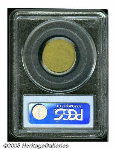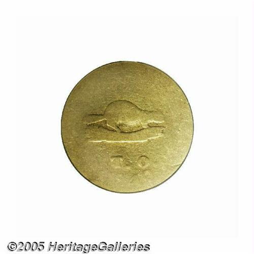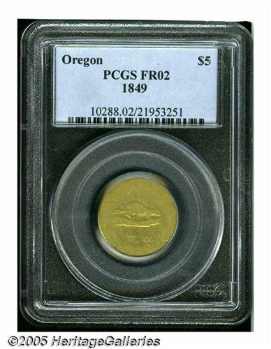 <B>1849<$5> Oregon Exchange Co. Five Dollar Fair 2 PCGS.</B></I> K-1, R.5. Oregon pioneers were among the first to hear of the discovery of large quantities of gold in California and among the first immigrants to the gold fields. Some of these miners returned to Oregon with bags of gold dust, which could not be efficiently traded. Private coinage was once again the solution, as the Oregon Exchange Company, composed of territorial politicians and merchants, sprang into being. Five and Ten Dollar gold coins were struck at a two-story building at the corner of 5th and Water Streets in Oregon City. Prominently featured on the obverse of their coins was the beaver, the symbol of the industrious Oregonian. This heavily worn example shows a fully outlined beaver. T.O. (for Oregon Territory) is clear, and the date is mostly legible. The reverse is worn smooth save for the denomination, 5 D. Listed on Page 307 of the 2005 <I>Guide Book.</B></I><BR><I>From The Great Western Collection of Territorial Gold.</B></I>