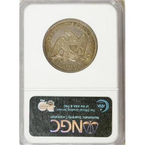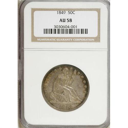 <B>1849 50C AU58 NGC.</B></I> Only a hint of friction denies this lovely example a Mint State grade. Pleasing luster shines beneath blue, green-gold, and violet patina on this sharply struck piece. The right obverse field has a small depression. A rim cud is present at 10 o'clock on the reverse. Census: 17 in 58, 39 finer (1/08).<BR><BR><B>Coin Engraver:</B> Christian Gobrecht<BR><BR><b>Shipping:</b> Coins & Currency (<a target="_blank" href="http://www.heritageauctions.com/common/shipping.php">view shipping information</a>)