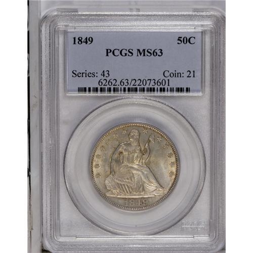 <B>1849<50C> MS63 PCGS.</B></I> Most silver-gray in the centers with hints of gold coloration clinging to many of the devices. The striking quality is exceptional throughout with all devices boldly defined. While not distracting, several wispy contact marks in the right obverse field preclude the near-Gem designation.