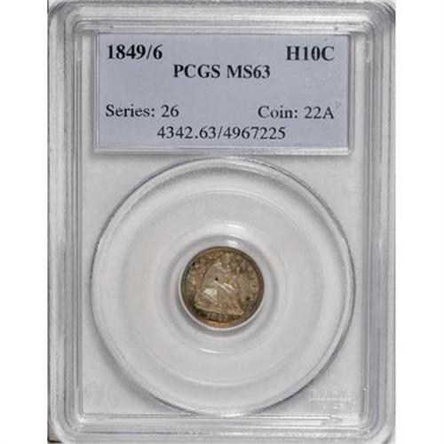 <B>1849/6 H10C MS63 PCGS.</B></I> The underdigit is easily visible under magnification. Less an overdate than a blundered date, this <I>Guide Book</B></I> variant is highly popular with Seated half dime collectors. Rose, orange, and lavender patina drapes each side of this softly lustrous, solidly struck Select representative. Population: 7 in 63, 9 finer (11/07).<BR><BR><B>Coin Engraver:</B> Christian Gobrecht<BR><BR><b>Shipping:</b> Coins & Currency (<a target="_blank" href="http://www.heritageauctions.com/common/shipping.php">view shipping information</a>)