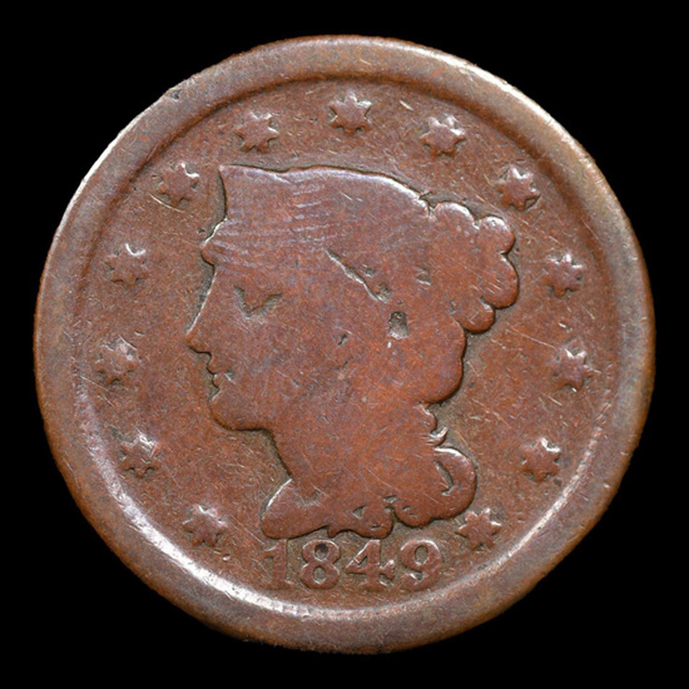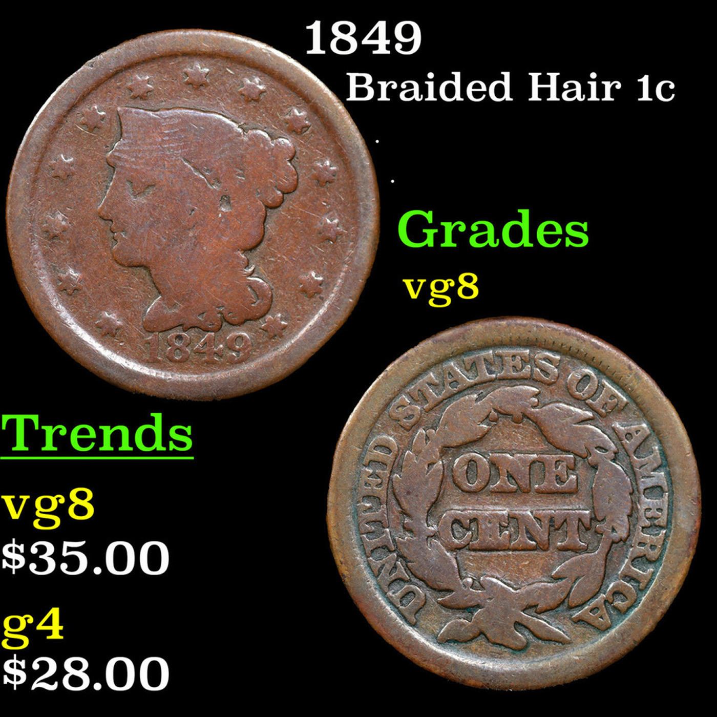 1849 Braided Hair Large Cent 1c Grades vg, very good.