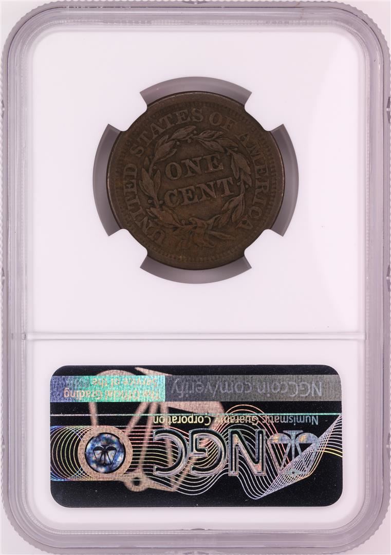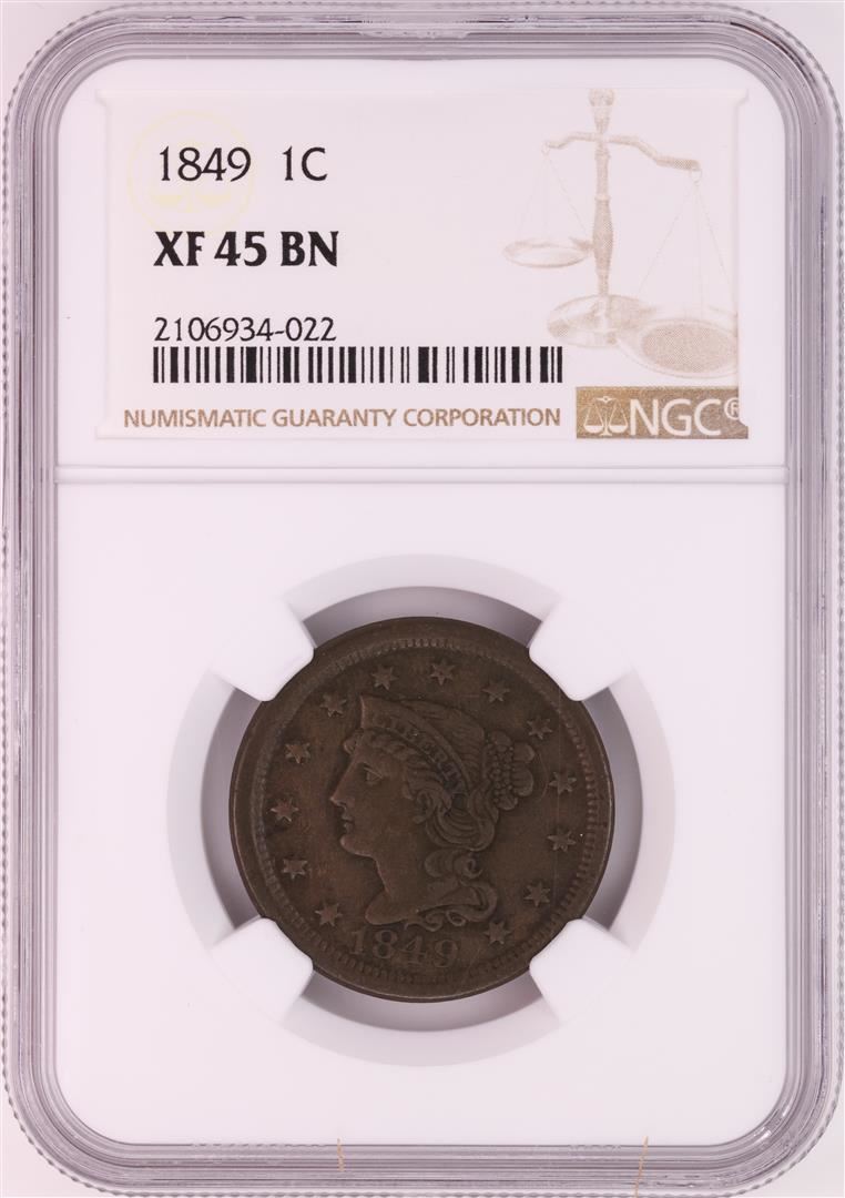 One 1849 Braided Hair Large Cent Coin NGC XF45BN. NGC Certified.