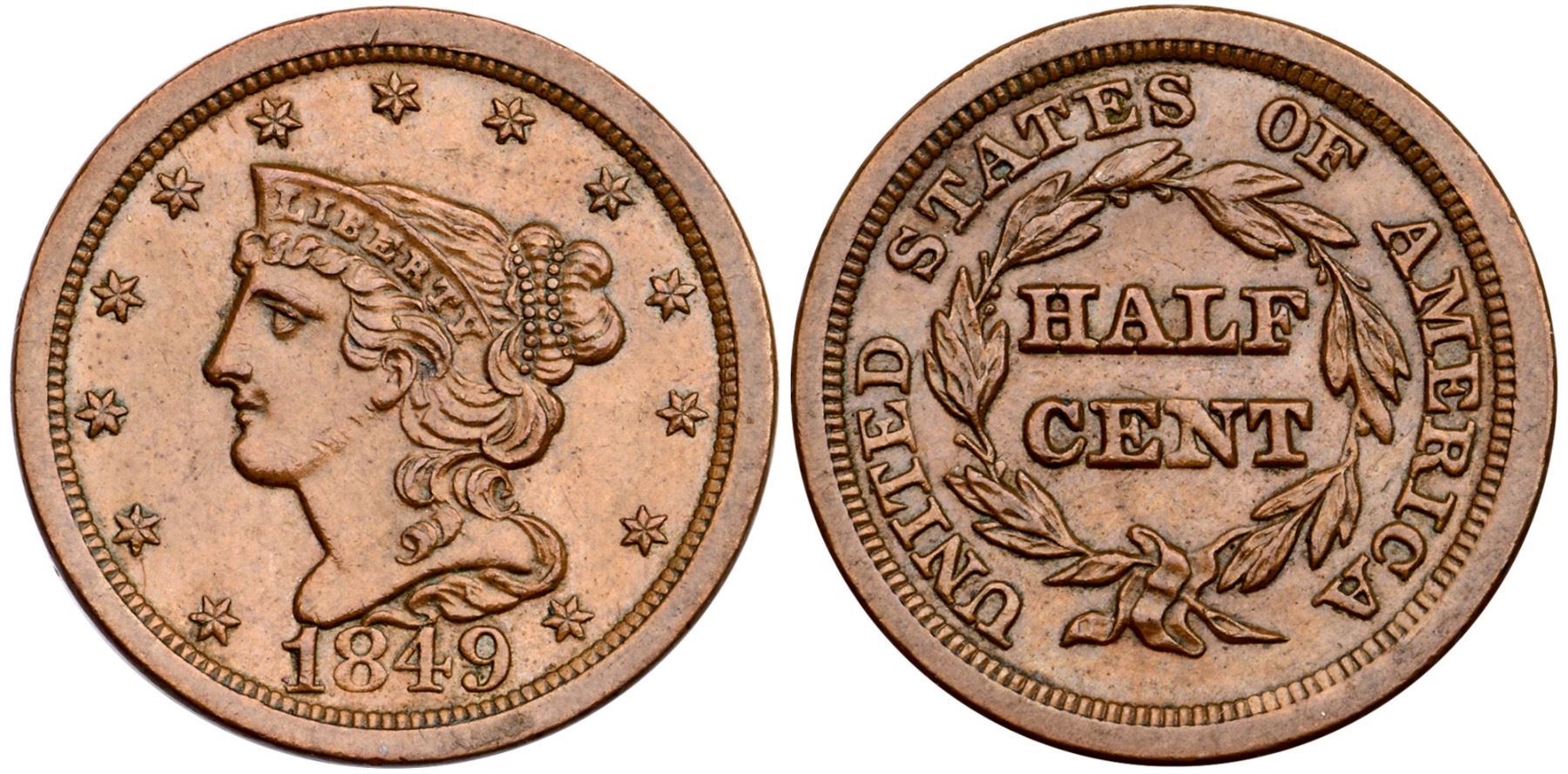 1849 C-1 R-2 AU55Rather glossy light brown brown surfaces. There are trivial marks and abrasions, nothing noteworthy or distracting, and dark crud buildup in some protected areas. Smooth surfaces with mint frost. Manley state 1.0.Certificate Number: Pedigree: Ex; Laurence H. Gardner Collection from the Buffalo and Erie County Historical Society - Stack's 3/15/2005:982 - Bob Kebler Collection