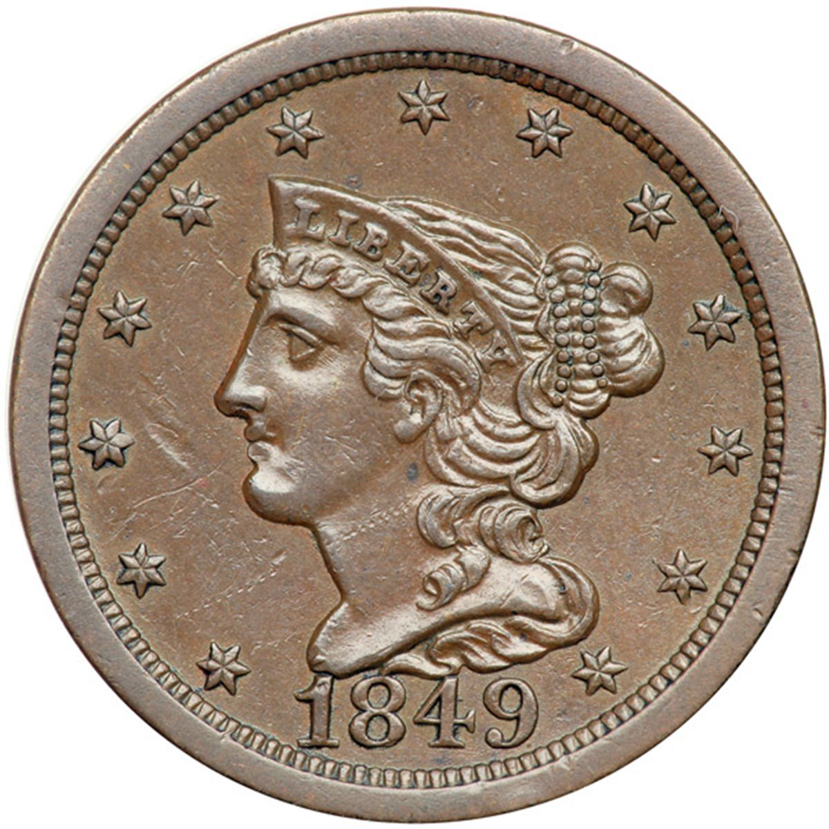 1849 C-1 R2 EF40. Five points sharper but there are a few light contact marks on the neck and in the field off the chin. The marks are trivial and the eye appeal of this piece is excellent. Choice glossy light chocolate brown and olive. Sharply struck E-MDS.