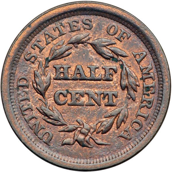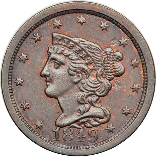 1849 C-1 R2- MS60. Glossy olive and chocolate brown with generous traces of mellowed mint red showing on the obverse and at least 20% of the brighter mint color remaining on the reverse. The obverse is very attractive and those fields are covered with fine die polishing lines from a fresh lapping. The only notable defect on the obverse is a small low spot in the field behind the main curl (caused by debris on the die). The reverse, however, shows many tiny low spots caused by debris (most likely lubricating grease). MDS, Manley state 2.0.