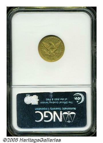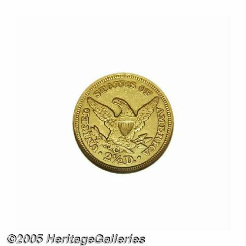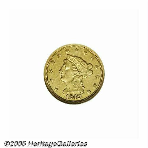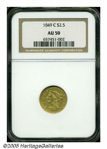 <B>1849-C<$2 1/2> AU50 NGC.</B></I> Variety 11-G. Doug Winter noted that only one die variety is known. Walter Breen alluded to a second variety when he noted "One die shows minute repunching on 49." It is probably the case that this repunching represents an early die state, and that Winter's comment is also correct. A lovely example with nearly full luster and attractive greenish-gold color. The surfaces are lightly abraded, much the same as nearly every survivor. Only 10,220 examples were coined. Overall, the '49-C Quarter Eagle is a scarce issue, and it is considered rare in any grade better than XF. Like nearly all known examples, the eagle's neck and leg are indistinct.