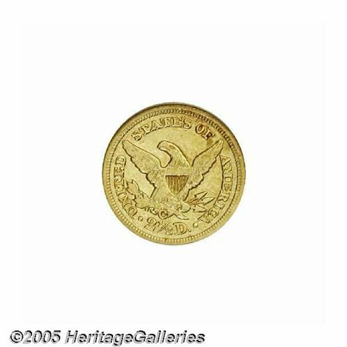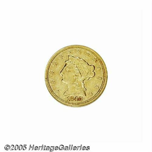 <B>1849-C<$2 1/2> AU55 NGC.</B></I> Variety 11-G. The 1849-C is generally regarded as the fifth rarest Charlotte quarter eagle out of the 20 coins in the series. Cleaning has taken a heavy toll on many XF and better coins, and there are also a considerable number of heavily abraded examples. This is a particularly pleasing coin, and one of the finest of the better AU pieces known. A bit softly detailed over the highpoints, as usually seen, the green-gold surfaces show an occasional dab of reddish patina, apparently from improper mixture of the gold / copper alloy. Numerous small abrasions are peppered over each side, but none are of singular importance.
