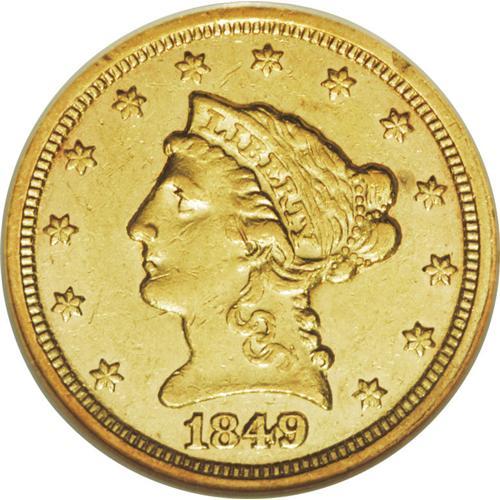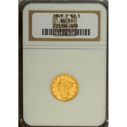 <B>1849-C $2 1/2 AU55 NGC.</B></I> Variety 11-G. This desirable Choice AU example has considerable luster and attractive lime-gold surfaces that show light abrasions and slight circulation wear. The stars, denticles, and most of Liberty's hair are bold. The eagle's left (facing) leg feathers, and right (facing) talons are softly struck. A nick on Liberty's cheekbone is noted for the sake of accuracy. Census: 10 in 55, 19 finer (8/06).<BR><BR><b>Shipping:</b> Coin/Currency (<a target="_blank" href="http://www.heritageauctions.com/common/shipping.php">view shipping information</a>)