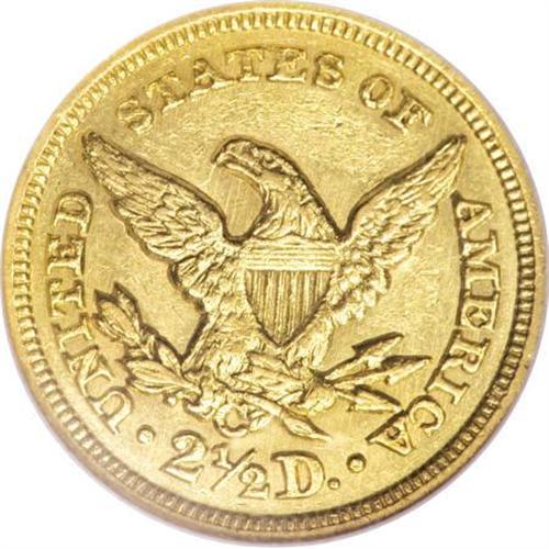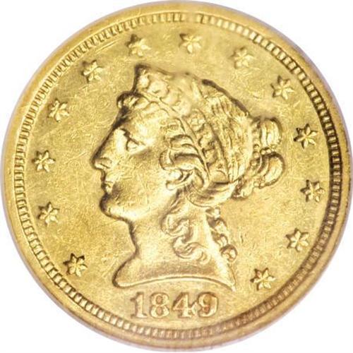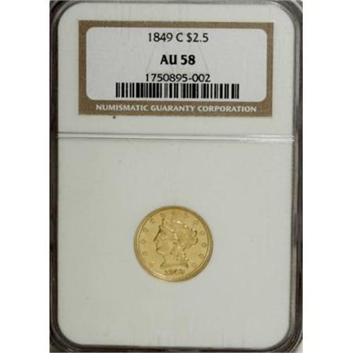 <B>1849-C $2 1/2 AU58 NGC.</B></I> Variety 11-G. Another of the elusive Charlotte quarter eagles, being one of just 10,220 pieces struck. This bright yellow-gold representative displays average-or-better sharpness in the centers and keeps a hint of reflective luster in the protected areas. The fields are less abraded than usual for the grade, although the cheek has a few thin marks. Census: 14 in 58, 6 finer (9/07).<BR><BR><B>Coin Engraver:</B> Christian Gobrecht<BR><BR><b>Shipping:</b> Coins & Currency (<a target="_blank" href="http://www.heritageauctions.com/common/shipping.php">view shipping information</a>)