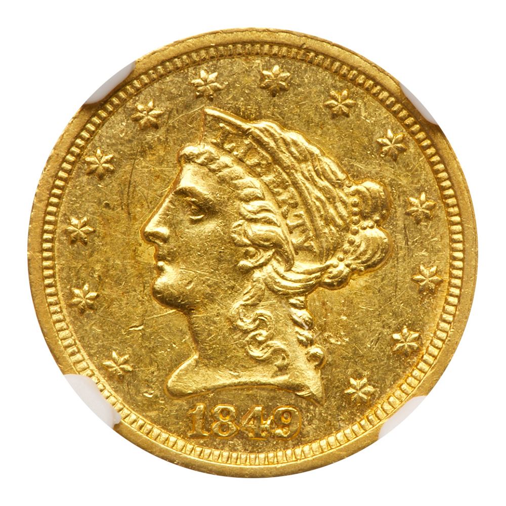 1849-C. NGC graded MS-60. This is a most challenging date and mint to find in mint condition. Here is one that just qualifies with full mint luster and a solid strike. The surfaces are mostly untoned. Scattered light handling marks are present, but none are deep or detracting. The C Mintmark is placed high up against the branch and talon of the eagle. A tough coin in particularly nice grade. Only 10,220 struck. Pop 3; 7 finer, 6 in 61, 1 in 65. PCGS # 7753 Estimated Value 9,000 - 10,000