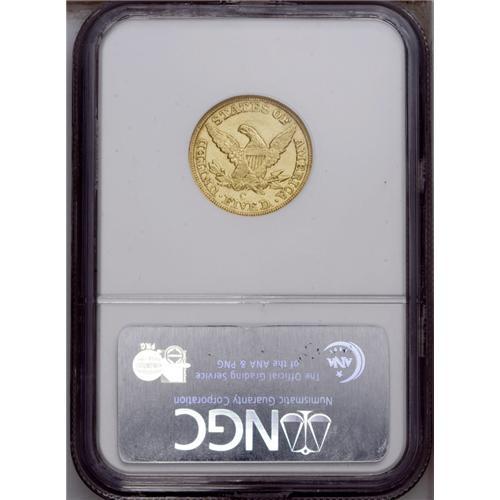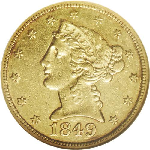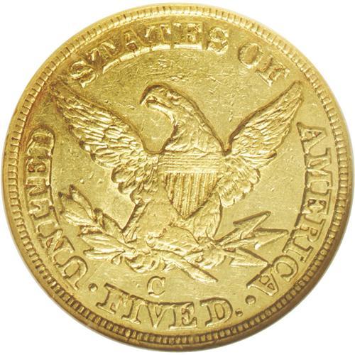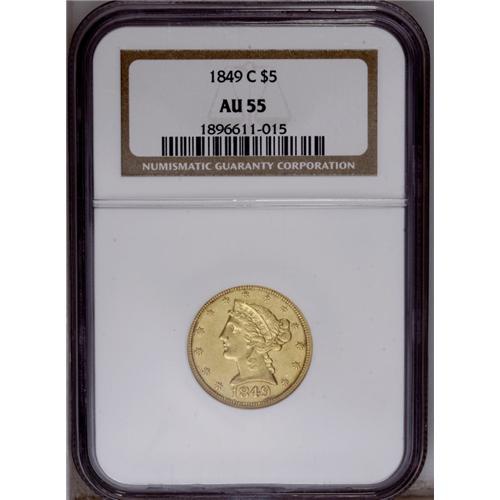 <B>1849-C $5 AU55 NGC.</B></I> Variety 12-F, State II. Bright green-gold surfaces with many tiny abrasions. The obverse luster is subdued by many tiny surface marks, while the reverse is slightly reflective. Lightly cracked from the leaves to the border, just grazing the upper left serif of U. This date, from a mintage of 64,800 coins, is one of the common Charlotte Mint half eagles.