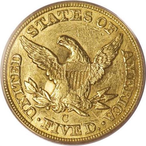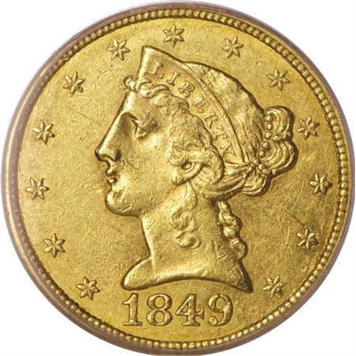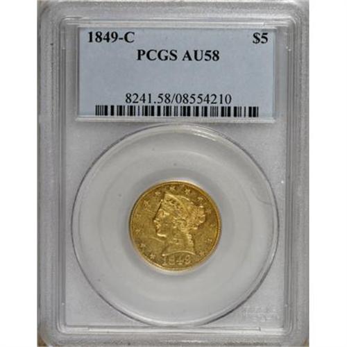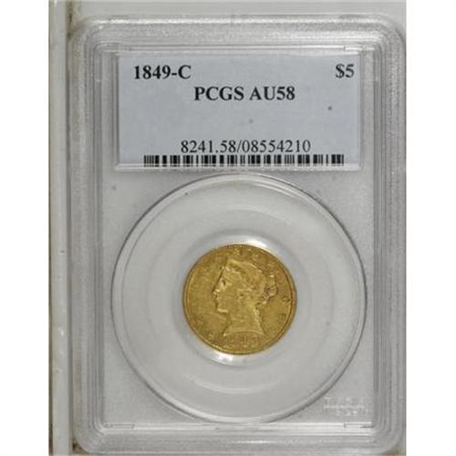 <B>1849-C $5 AU58 PCGS.</B></I> Variety 12-F. This canary-gold near-Mint Charlotte gold piece lacks relevant marks, and the strike is sharp throughout the peripheries. Moderate blending of detail on the eagle's left (facing) leg and on the curls near the ear is usual for the issue. Population: 5 in 58, 11 finer (6/07). <BR><BR><B>Coin Engraver:</B> Christian Gobrecht<BR><BR><b>Shipping:</b> Coins & Currency (<a target="_blank" href="http://www.heritageauctions.com/common/shipping.php">view shipping information</a>\)