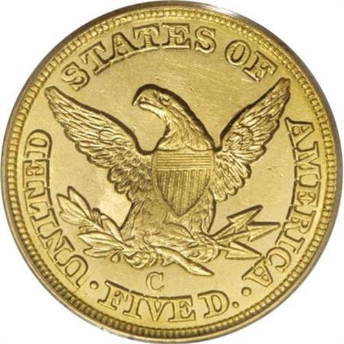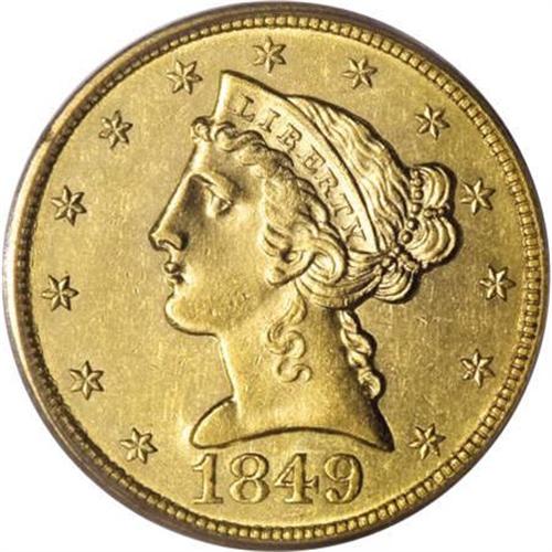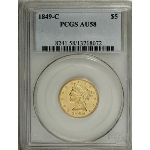 <B>1849-C $5 AU58 PCGS.</B></I> Variety 12-F. Die State II with a reverse crack from the rim just past the left side of the U in UNITED into the leaves ending in the eagle's right leg. The obverse is quite well struck while the reverse has some weakness on the right leg. The obverse is a bit "ticky" with some abrasions seen in the fields while the reverse is surprisingly clean and choice. The luster is satiny in texture and much of the original surfaces are intact; the luster on the reverse is, in fact, nearly full and it suggests a Mint State coin. Struck in light green-gold and showing nicer color than usual for the date, this is an attractive, affordable high grade piece that would work well in a type set.<BR> The 1849-C is among the most available half eagles from this mint. In AU as many as four to five dozen are known and examples can be found in AU55 to AU58 without difficulty. In Uncirculated, an estimated 10 to 12 pieces are known with the finest an incredible NGC MS66 that was first offered as lot 330 in the Bowers and Merena March 1998 auction.<BR><I>From The Carolina Circle Collection.</B></I><BR><BR><B>Coin Engraver:</B> Christian Gobrecht<BR><BR><b>Shipping:</b> Coins & Currency (<a target="_blank" href="http://www.heritageauctions.com/common/shipping.php">view shipping information</a>)