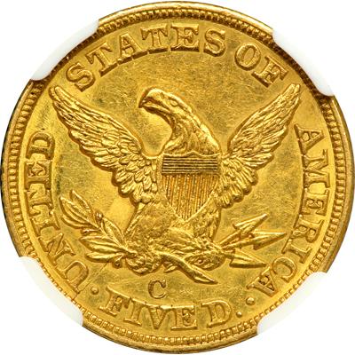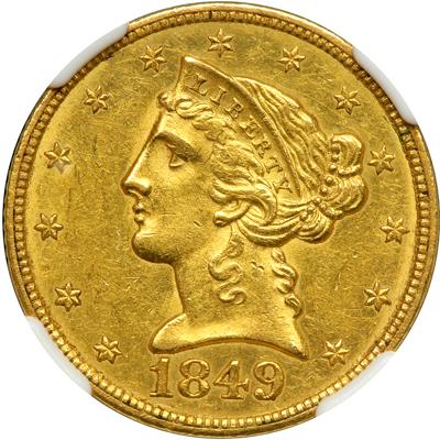1849-C $5 Liberty. NGC graded MS-61. Nice and problem free with delicate light toning. Strong metal flow with frosty tendency augments the already showy mint luster that covers the surfaces, giving the coin a brand new, glowing appearance right in line with its Mint State grade. No signs of cleaning. And best of all, none of the usual torrent of small marks, only a scattered few here and there. Of course, collectors seeing the photos understand this coin is more than adequately struck for an 1849-C half eagle, best of all with only localized weakness on the left leg of the eagle. Certainly a coin that gets proper mention where completeness of design is difficult to attain. 64,823 coins struck. Pop 11; 6 in 62, 3 in 63, 2 in 64. In a new NGC 4 pronged holder (PCGS # 8241).
